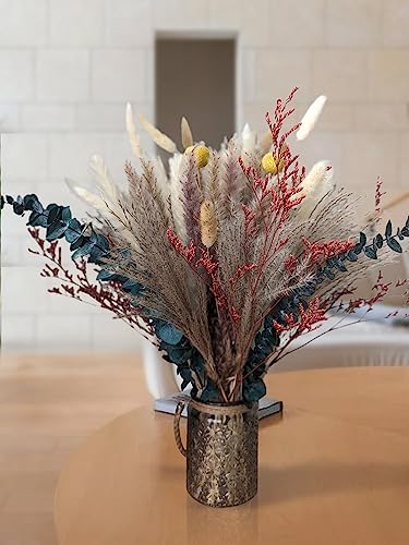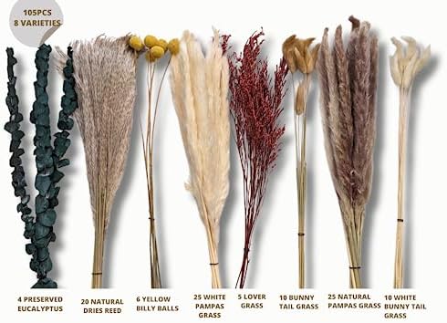 VARIOUS COMBINATIONS – MEGA-VALUE BOUQUET: Get 25pcs natural pampas grass, 25pcs white pampas grass, 10pcs white bunny tails pampas grass, 10pcs natural bunny tail grass, 20pcs natural dried reed, 5pcs lover grass, 6pcs yellow billy tails, and 4pcs preserved eucalyptus at a great price.
