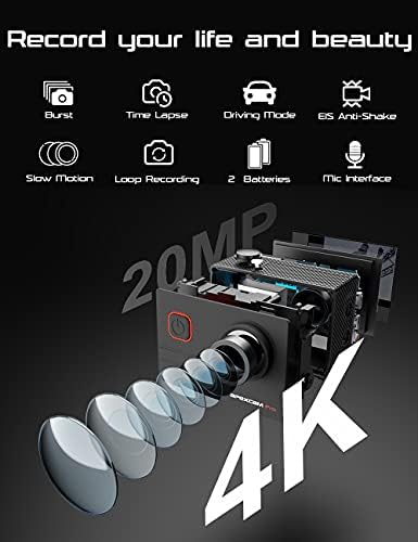 [2023 New]Apexcam 4K EIS 20MP WiFi Pro Action Camera 170° Wide-Angle Ultra HD Sports Camera External Mic Waterproof Underwater Cam With Remote Control Selfie Stick 2x1200mAh Batteries and Accessories