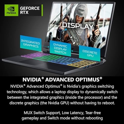 The Acer Nitro 16 gaming laptop with DLSS 3 gives you all the latest tech, so you can chat, browse, stream, edit, record, and play without skipping a beat. Fire it up and go full throttle courtesy of its 13th Gen Intel Core processor and NVIDIA GeForce RTX 4050 laptop graphics. The picture-perfect 16-inch WQXGA display with up to a 165Hz refresh rate supports NVIDIA Advanced Optimus and NVIDIA G-SYNC technolog