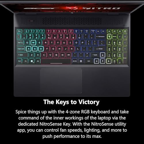 The Keys to Victory: Spice things up with the 4-zone RGB keyboard and take command of the inner workings of the laptop via the dedicated NitroSense Key. With the NitroSense utility app, you can control fan speeds, lighting, and more to push performance to its max.