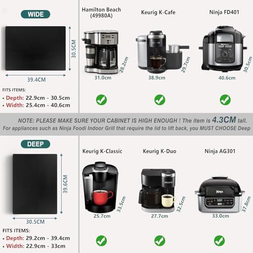 【Size selection suggestion】 WIDE is suitable for home appliances with a bottom depth of no more than 30.5cm, while DEEP is suitable for appliances with a depth of 30.5 -39.4cm. Please choose the appropriate size according to the depth of the bottom of your appliance. NOTE: The height of the sliding tray is 4.3cm, PLEASE MAKE SURE YOUR CABINET IS TALL ENOUGH.