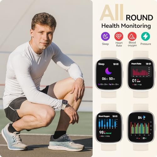 【Health Monitoring & Real-time Fitness Tracker】The smartwatches provide heart rate monitor blood oxygen monitor, tracking calories, step counter, distance, and workout time, and keeping track of your workout; smart watch equipped with advanced sensors, automatic sleep monitoring for comprehensive sleep analysis (wakefulness, light sleep, deep sleep). Pressure Score management makes informed decisions about your health status and adjusts your lifestyle accordingly.