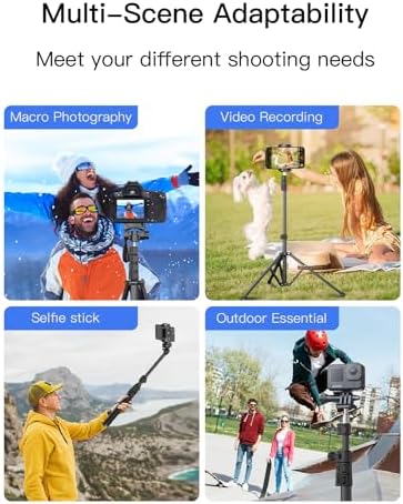 Extendable Tripod: Our aluminium alloy tripod offers adjustable legs, it can extend from 17 to 67 inches, allowing you to set the desired height for the perfect angle and composition. Extend or retract the tripod legs to adapt to various shooting environments and achieve the ideal stance