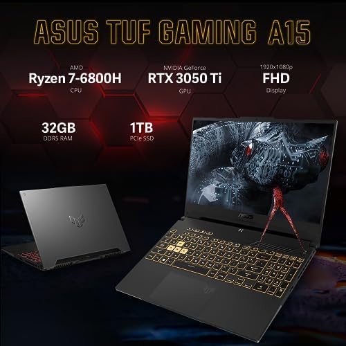 ASUS TUF A15 15.6″ FHD 144Hz Gaming Laptop, AMD Ryzen 7-6800H Processor, 32GB DDR5 RAM, 1TB PCIe SSD, Backlit Keyboard, GeForce RTX 3050Ti 4G, HD Webcam, Win 11, Gray, 32GB Hotface USB Card