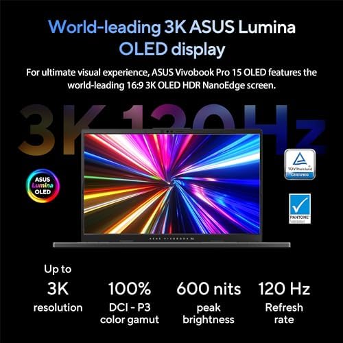 ASUS LUMINA OLED DISPLAYS: Stunning visual experience: Offering ultra-vivid 15.6” 3K (2880 x 1620) resolution, 600-nit HDR peak brightness, 100% DCI-P3 color, and a 16:9 aspect ratio. Immerse yourself in visuals with 84% screen-to-body ratio and Adaptive Sync for a smooth 120Hz refresh rate. Certified for true-tone color by Pantone and VESA, with low-blue light certification from TÜV Rheinland.