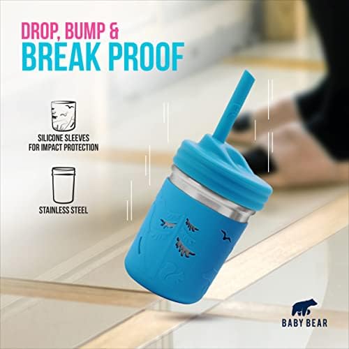 Baby Bear Products Kids Cups – Set of 4, 250ml Stainless Steel Mason Jar with Silicone Sleeves and Straws with Stoppers | Smoothie Cups | Toddler Sippy Cups