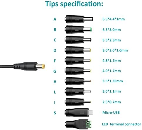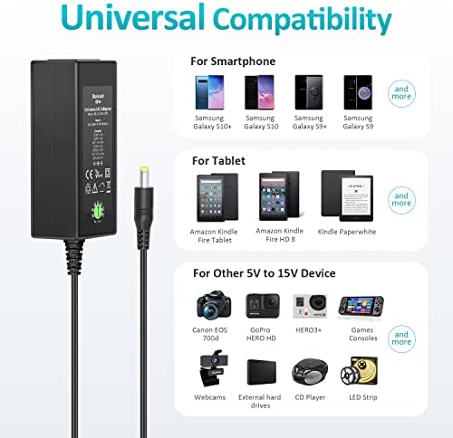 Come with 11 different dc plugs, Compatible with 98.5% of 5-15V household electronic devices, such as Smartphone, Tablet, Scales, Routers, Speakers, LED Strip Lights, CCTV camera system, USB Charging Camera and more.