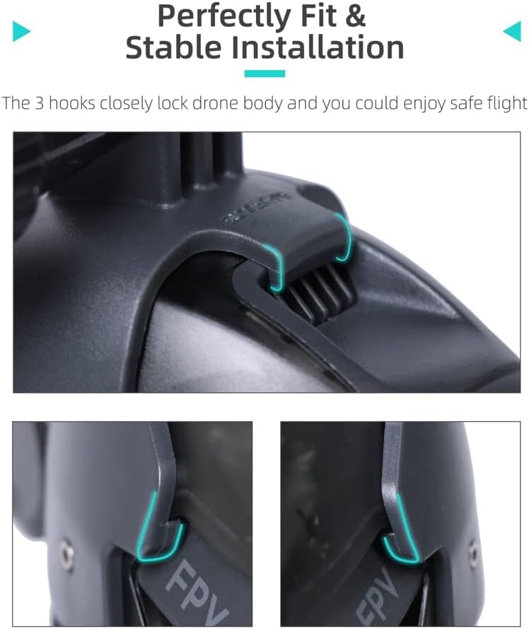 Perfectly fit and stable installation, the 3 hooks closely lock drone body and you could enjoy safe flight, fixed on drone with screws, guarantee absolute safety of your device