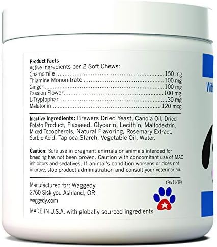 NATURAL CALM AID: waggedy’s calming soft chews are proven effective at relieving hyperactive and aggressive behaviors in both dogs and cats. It is specially formulated with melatonin, L-Tryptophan, chamomile flowers, passion flower, and ginger. An all-natural anxiety relief for your dog or cat, these calming supplements support the nervous system to help lessen their anxiety, especially in a stressful environment.