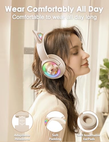 【Cute & Stylish Look】These cat ear Bluetooth headphones are perfect for kids teens and adults who want to add a touch of fun to their gaming or music experience. You or your kids will love the cat ears and cute kitty. Rainbow LED cat ears and capsules will light up when connected to the device via Bluetooth. The lights can be turned off at any time.