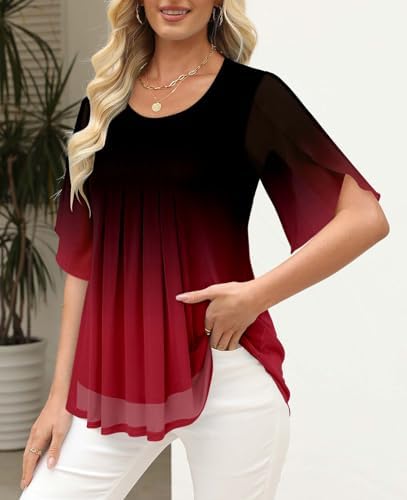 CHICZONE Women Summer Short Sleeve Shirt Round Neck Double Layers Mesh Blouse Trendy Pleated Tunic Tops