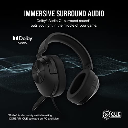 The CORSAIR HS55 SURROUND Gaming Headset delivers essential all-day comfort and sound quality with memory foam leatherette ear pads and Dolby Audio 7.1 surround sound on PC and Mac, without weighing you down thanks to lightweight construction. An omni-directional microphone picks up your voice loud and clear, and custom-tuned 50mm neodymium audio drivers offer great sound quality and range. A 3.5mm audio connector ensures wide compatibility with most devices, including PC, Mac, Xbox Series X | S, PS5 with Tempest 3D AudioTech support, PS4, Nintendo Switch, and mobile devices. Powerful CORSAIR iCUE Software unlocks audio equalizer settings, multi-channel 7.1 surround sound, and more. Complete with on-ear volume control for convenient audio adjustments, you can press play on great audio with the HS55 SURROUND.