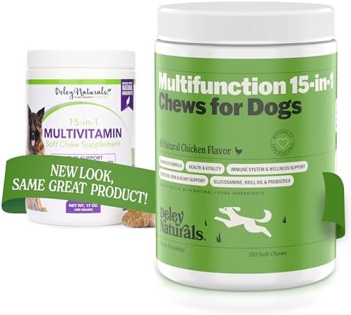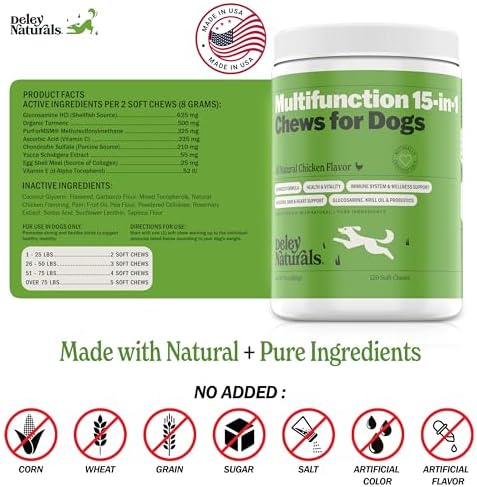 Deley Naturals 15 in 1 Dog Multivitamin Treats, 120 Grain Free Soft Chews – Immune System, Skin & Coat, Joint Support & Digestion – Vitamins for Dogs of All Ages – Made in USA – Chicken Flavor