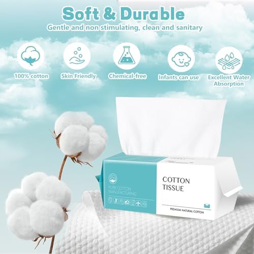 【Dry and Wet Dual-Purpose】: Absorbent durable cotton towel, not easy to tear up as paper tissue. Use as cotton tissue to clean babys teeth, eyes, nipple and bottom, electronic products, etc.Add water to become wet wipe, ideal for makeup removal, house cleaning, etc.It can be washed and used 2-3 times