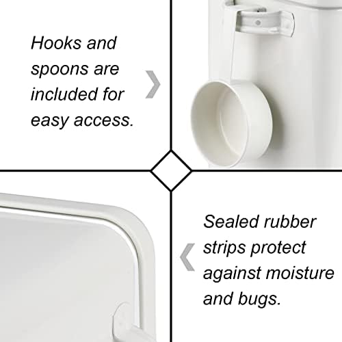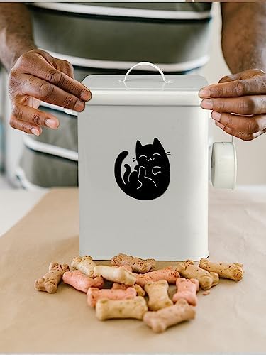 EASY TO USE AND CARRY: The cat food storage box comes with a sturdy metal scoop that hangs on the side of the storage box for easy transfer of food to a dog or cats bowl, while the measuring cup not only lets you know the dog/cat at each meal Quantity of cat food. Comes with a metal handle for easy grip while in use.