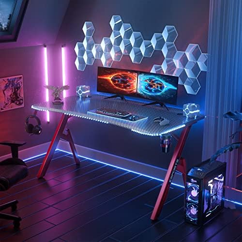 Ecoprsio Gaming Desk, 47 Inch Gaming Computer Desk with Carbon Fiber Desktop, Large Y Shaped Gamer Desk with Cup Holder and Headphone Hook, 47.2” Game Table for Gamer Room, Workstation, Bedroom, Red