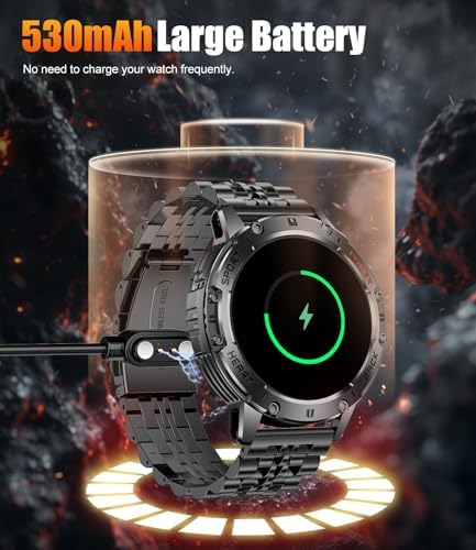 💧🔋【IP68 Waterproof and Extended Battery Life】This smart watch for men is rated IP68 waterproof, allowing you to confidently wear it while washing hands, showering, and running in the rain. (Note: Do not wear it while swimming, diving, bathing, or in a sauna.)With a 530mAh battery, this rugged smart watch can last 5-7 days on a full charge (approximately 2-3 hours of charging), and it has a standby time of up to 50 days.