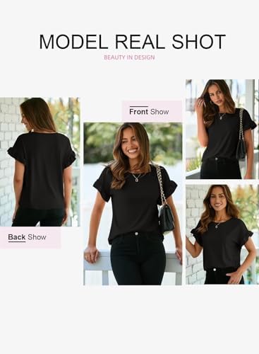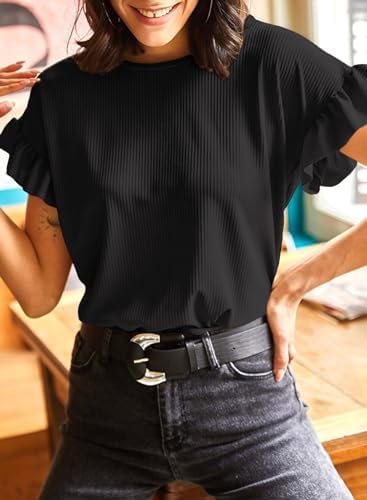 EVALESS Womens Summer Casual Tops Short Sleeve Ruffle Plain Round Neck T Shirts Ladies Knit Loose Fit Tee Tops Blouses