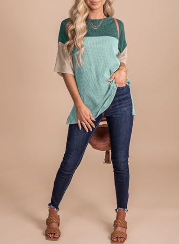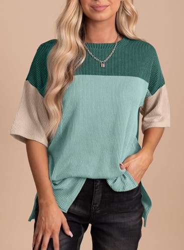 EVALESS Womens Summer Short Sleeve Crewneck Shirts Tops 2024 Fashion Color Block Casual Tunic Top