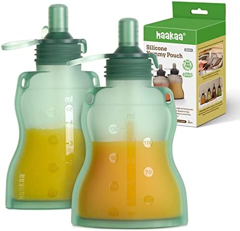 haakaa Yummy Pouch Reusable Baby Food Pouch, Reusable Pouches for Toddlers Kids Squeezable Pouch, Washable Freezer – Make Homemade Organic Food for Babies/Toddlers, 4oz, 2 Pack (Pea Green)