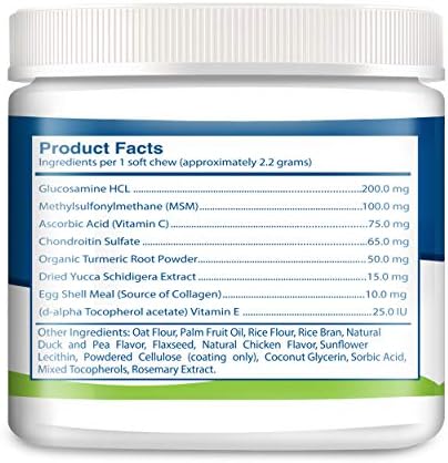 MADE IN the USA: These canine chews are formulated with finesse in the USA. at GMP Certified facility, using Glucosamine HCL, Methylsulfonylmethane, Ascorbic Acid, Chondroitin Sulfate, Organic Turmeric Root Powder, Dried Yucca Schidigera Extract, Egg Shell Meal, and Vitamin E.
