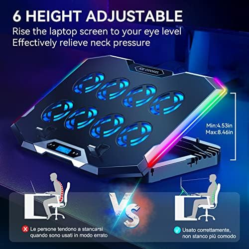 ICE COOREL Gaming Laptop Cooling Pad with 8 Cooling Fans, Laptop Fan Cooling Pad for Laptop 15-17.3 Inch, RGB Laptop Cooler Stand with 6 Height Adjustable, Two USB Port, Phone Stand