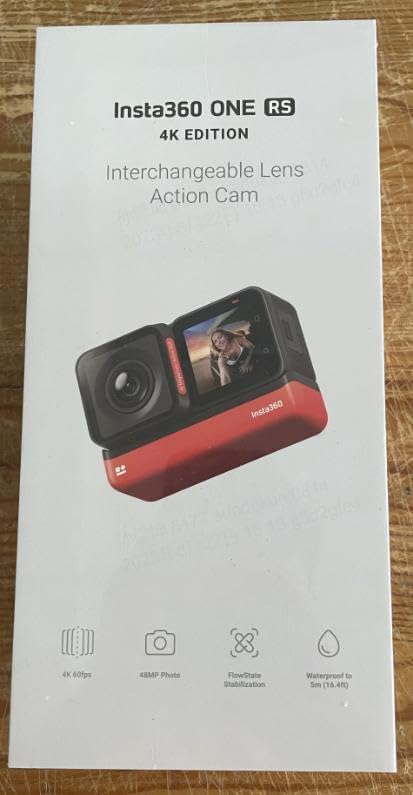 Aperture & Focal Length Aperture: F2.4. Equivalent Focal Length: 16mm Photo Resolution 8000×6000 (4:3), 8000×4500 (16:9), 4000×3000 (4:3), 4000×2250 (16:9) Video Resolution 6016×2560@25/24fps (under 6K Widescreen Mode), 4000×3000@24/25/30fps, 3840×2160@24/25/30/50/60fps, 2720×1530@24/25/30/60/100fps, Photo Format jpg, RAW. RAW files are DNG and require software on PC/Mac to export Video Format mp4 (For files prefixed with “PRO_”, please import into app/Studio to adjust aspect ratio and apply Post FlowState stabilization) Photo Modes Standard, HDR, Interval, Night Shot, Starlapse, Burst, PureShot Video Modes Standard Video, Slow Motion, Active HDR, Timelapse, TimeShift, Loop Recording, 6K Widescreen, FlowState (in-camera stabilization), Post FlowState (in-app stabilization) Weight & Dimensions (W x H xD) 125.3g, 70.1×49.1×32.6mm Run Time 75 minutes *Tested in lab environment under 4K@60fps FlowState mode. Color, Gyroscope & Bitrate Color Profiles: Standard, Vivid, LOG. Gyroscope: 6-axis Gyroscope. Max. Video Bitrate: 100Mbps Compatible iOS Devices Compatible with iOS mobile devices with chips A11 or above and iOS version 11.0 or above, including iPhone SE 2, iPhone 8, iPhone 8 Plus, iPhone XR, iPhone XS, iPhone XS Max, iPhone X, iPhone 11, iPhone 11 Pro, iPhone 11 Pro Max, iPhone 12, iPhone 12 Pro, iPhone 12 Pro Max, iPhone 12 mini, iPhone 13, iPhone 13 Pro, iPhone 13 Pro Max, iPhone 13 mini, iPad Air (2020), iPad Pro and newer iPad models. Compatible Android Devices Compatible with Android mobile devices with Kirin 980 and above chips (Huawei Mate 20, P30 or newer models), Snapdragon 845 and above chips (Samsung Galaxy S9, Xiaomi Mi 8 or newer models), Exynos 9810 and above chips (Samsung Galaxy S9, S9+, Note9 and newer models) and Tensor chips (Google Pixel 6). Bluetooth, Wi-Fi & USB Bluetooth: BLE5.0. Wi-Fi: 2.4GHz, 802.11b/g/n; 5GHz, 802.11a/n/ac (Standard range of approximately 20 meters, max transmission speed of 20MB/s). USB: Type-C *Note: This camera only supports wired connection to Android devices (via Micro-USB or Type-C). It does not support wired connection to iOS devices. Full wireless support is available for both iOS and Android. Storage exFAT formatted microSD cards with the UHS-I bus interface and Video Speed Class V30 rating (exactly this class, neither higher or lower) with a max storage of 1TB are recommended. Charging Battery Capacity: 1445mAh. Charging Method: USB Type-C. Charging Time: 70 minutes (powered off). Operating Temperature: -4°F to 104°F (-20℃ to 40℃) Notes Insta360 ONE RS is waterproof to 5 meters when assembled (all components are locked together and secured in the Mounting Bracket). Use the Dive Case to protect your camera in deep or rough water conditions (e.g. surfing). Consult the manual for full waterproofing precautions.