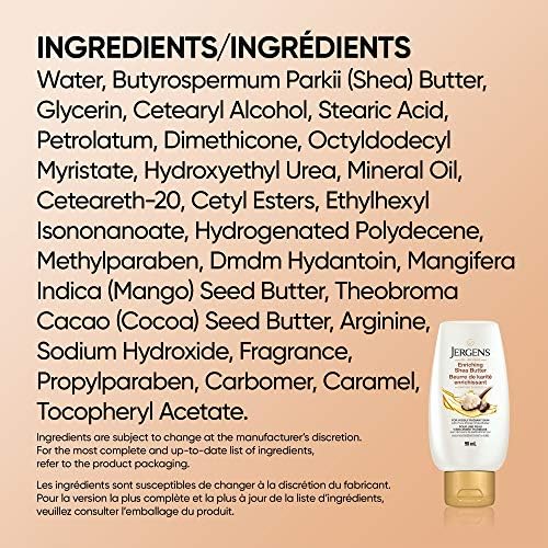 Give your skin a natural-looking radiance with Jergens Enriching Shea Butter Moisturizer and body lotion. This nourishing oil-blend formula, infused with pure African shea butter, deeply conditions and enhances your natural sheen. The lotion conditions dry, dull areas to reveal skin that’s luminous and 3X as radiant. Use every day and through every season to relieve dryness, replenish moisture, and deeply nourish skin. Oil-infused formulas from Jergens Skincare lock in 24-hour hydration using the moisturizing power of essential ingredients. Absorbs quickly and leaves skin with a light, fresh scent and no greasy feel; available in convenient 620 mL and 90 mL sizes; dermatologist tested and cruelty-free.