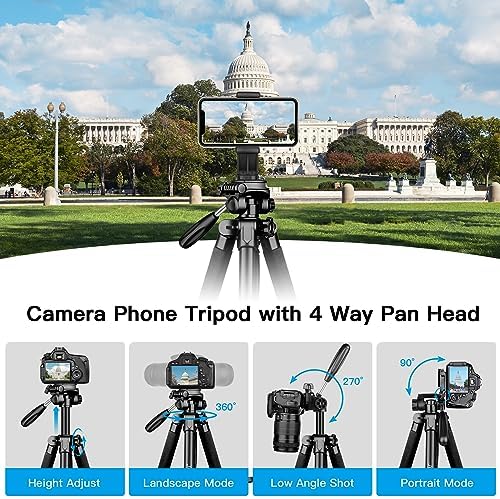【5 IN 1 Professional Tripod】 Lightweight and compact tripod with additional quick-release plates and phone mount, Standard 1/4″ screw mount compatible with all cameras, DSLR, Camcorder, projector, ring light, spotting scopes. Tripod for camera with a 360° phone mount is compatible with most of cellphone, it creates endless possibilities on your journey.