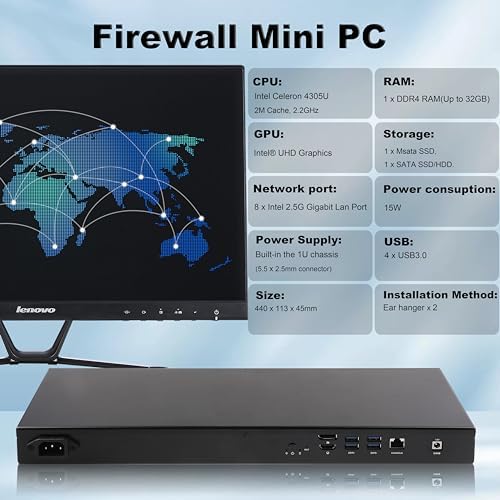 KETUOPU 1U Rack Mini PC Firewall Router K4305U8 with Celeron 4305U, 4G DDR4 RAM 128G SSD Micro Firewall Appliance, 8*Intel 2.5Gigabit Ethernet, 1*COM RS232, AES-NI, for Home/Office/School/Hotel