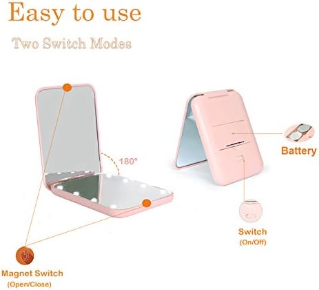 Kintion Pocket Mirror, 1X/3X Magnification LED Compact Travel Makeup Mirror, Compact Mirror with Light, Purse Mirror, Folding, Handheld, Small Lighted Compact Mirror for Gift, Pink
