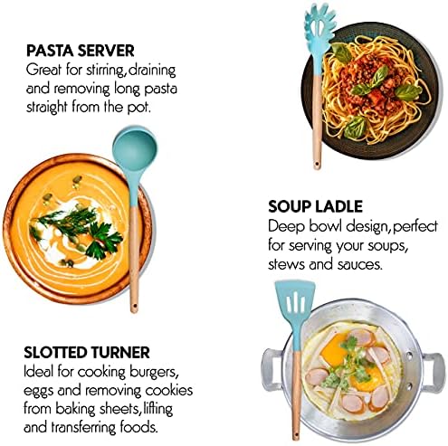 Hard-Wearing cooking utensils set – Every little detail is focused to offer best functionality to last endlessly silicone cooking utensil set handles are crafted using high-grade premium wood, along with durable silicone attached heads to prevent popping out. Our kitchen utensils are perfect for everyday use as it provides easy handling without bending, breaking or rusting
