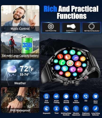 🔋【1.43 Inches 466*466 pixels AMOLED Colour Screen and 400mAh Large Battery】The men’s smartwatch boasts a 1.43″ IPS full-touch AMOLED screen with a high-definition resolution of 466*466. The touchscreen keep the display continuously on, response is nimble, providing a delicate visual quality and an enhanced interactive experience. This smartwatch only takes 2.5 hours to charge. It can be used for 5-7 days and can stay on standby for up to 20 days, surpassing the usage time of most watches by a significant margin.