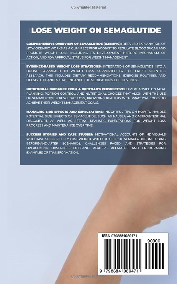 “Dive into the comprehensive guide ‘Lose Weight on Semaglutide’, where you’ll find an in-depth exploration of Semaglutide (Ozempic and Wegovy ) as a powerful tool for weight management. Discover how this GLP-1 receptor agonist regulates blood sugar and promotes weight loss, backed by detailed explanations of its mechanism of action, development history, and FDA approval status for weight management. From evidence-based weight loss strategies to nutritional guidance from a dietitian’s perspective, this book equips readers with the knowledge and tools needed to achieve their weight management goals effectively. Learn how to navigate potential side effects, set realistic expectations, and draw inspiration from real-life success stories and case studies. Whether you’re considering Semaglutide as part of your weight loss journey or already using it, this guide offers valuable insights and practical advice to support your efforts.”
