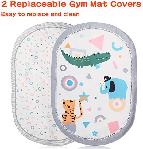 Lupantte 7 in 1 Baby Play Gym Mat with 2 Replaceable Washable Mat Covers Baby Activity Play Mat with 6 Toys, Visual, Hearing, Touch, Cognitive Development for Infant and Toddler, Thicker Non Slip