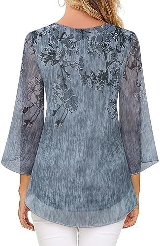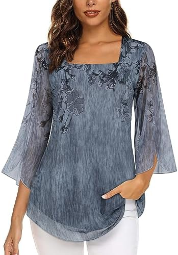Luranee Women’s 3/4 Sleeve Square Neck Floral Blouses Shirts Double Layers Casual Office Flowy Dressy Tunics Tops S-2XL