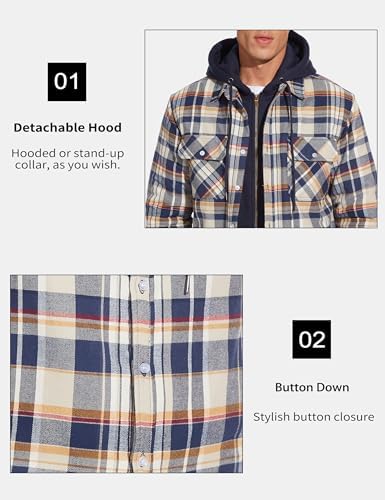 MAGCOMSEN Men’s Flannel Shirt Jacket with Removable Hood 5 Pockets Plaid Quilted Lined Winter Coats Thick Hoodie Outwear