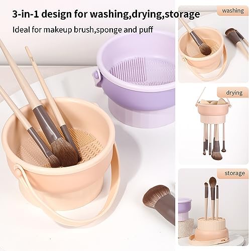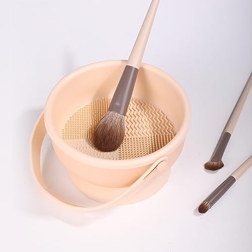 Makeup Brush Cleaning Mat, MSQ 3 In 1 Silicone Makeup Brush Cleaner Bowl with Brush Drying Holder, Makeup Brush Scrubber for Makeup Brush, Makeup Sponge, Powder Puff (Orange)