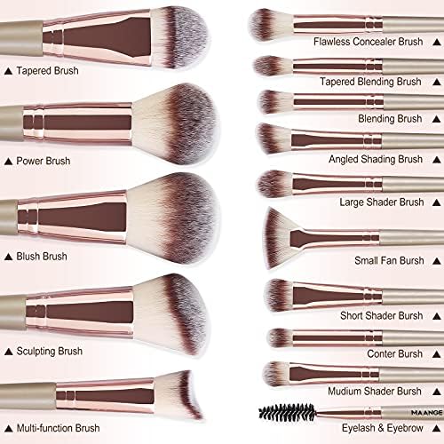 MAANGE MAKEUP BRUSHES SET: Contains 15 basic makeup brushes for liquid foundation, eye shadow, concealer, etc. 1 makeup brush bag, 1 FREE makeup sponge and 1 FREE Brush cleaner mat. A full set of makeup equipment, take care and storage of your make up brushes, save worry and effort, and Let each makeup brush give full play to its effect and not be left unused.