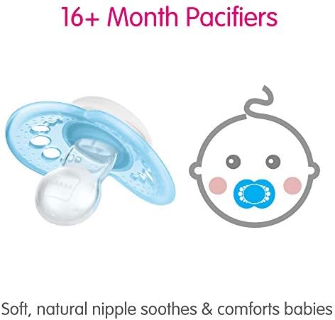 Designed with cute and colourful animal designs and with a specially designed larger nipple that fits into their growing mouths, both you and your baby will love this MAM Pacifier. Developed by leading pediatric dentists and developmental psychologists to provide maximum comfort and style for babies 16 months and older.* MAM soothers feature an innovative nipple designed to promote healthy oral development so you can soothe your baby with confidence. Baby will love latching onto the soothing pacifier nipple that, with the help of a built-in air channel, naturally flattens and extends when sucked, mimicking a woman’s nipple when breastfeeding. All MAM pacifiers are orthodontic, featuring a symmetrical nipple that fits perfectly in baby’s mouth at any angle. MAM’s medically engineered nipples all feature life-like, SkinSoft textured silicone that feels more natural, just like mom. With multiple pacifier shapes and sizes to choose from, MAM nipples are easily accepted by babies of all ages, with 94% nipple acceptance among babies tested.** Babies simply love the ease and comfort of latching onto MAM nipples. Sterilize baby’s MAM pacifier in the microwave using the convenient MAM self-sterilizing storage case. Microwave disinfection is proven effective in killing common household germs and bacteria. Pacifers kept in the closed box will remain disinfected for up to 48 hours: Fill pacifier case with water. Place pacifier in the pacifier case with the nipple facing down. Follow pacifier package instructions for microwave setting. Cool completely before use. *Developed with the International Children’s Medical Research Society. **Market Research 2009-2017, tested with 1,508 babies.