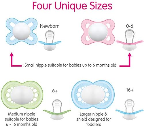 SYMMETRICAL NIPPLE – The larger nipple on these pacifiers for babies is specifically designed for 16+ months and adapts to baby’s mouth, so the binky is always in the correct position.