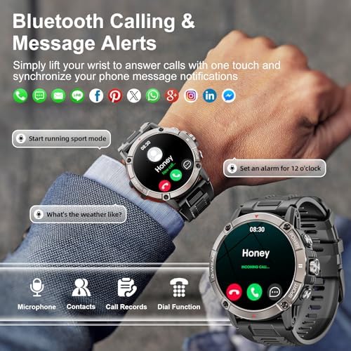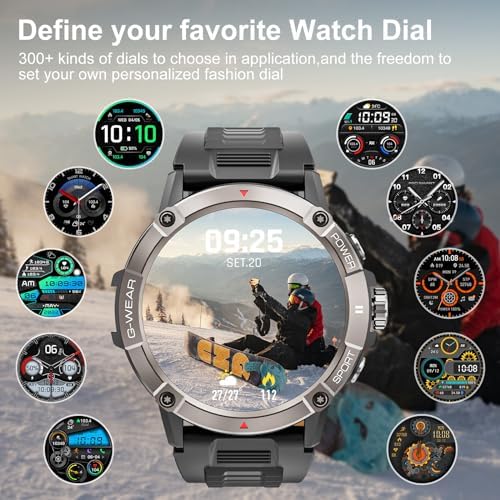 【1.52″ AMOLED Smartwatch& Personal Custom Watch Dial】1.52” HD military smart watch adopt AMOLED screen , Always-on Display,360*360 pixels touch screen, 326PPI high-definition resolution, enhances color and claritym,Fearless of sunlight, giving you clear images all day long! Compared with the LCD screen, the AMOLED screen consumes lower energy and saves power.Smart watches For men include 6 dials as well as another 300+ different and cool dials in the app to choose from. And you can custom your smartwatches dial according to scenes to show your personality and fashion.