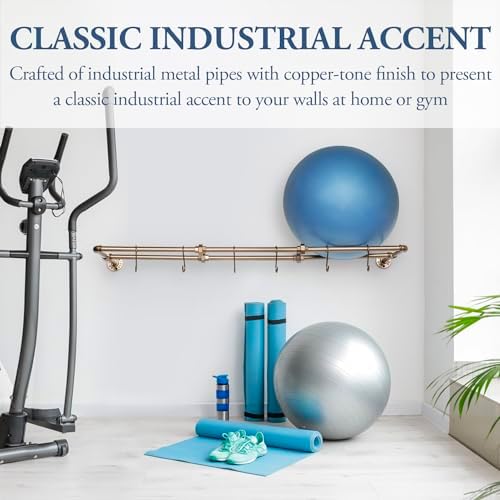 Conveniently store important fitness equipment in one easy to locate place with this industrial style copper-toned metal pipe design wall mounted yoga ball storage rack. Featuring a large rack that holds up to 2 large or 3 small exercise or stability balls, while 6 S-hooks hang other exercise equipment such as yoga mat bags, jump ropes, resistance bands, and exercise straps, keep all gym essentials organized and within reach. Wall mounted design clears up valuable floor space and can be securely and easily mounted to most wall surfaces with the included mounting hardware, making it ideal for any home gym, fitness studio, or commercial gym setting. Display modern style with functional utility with this wall mounted ball and equipment holder rack and never misplace fitness equipment or have exercise balls roll away again.**Some assembly required**