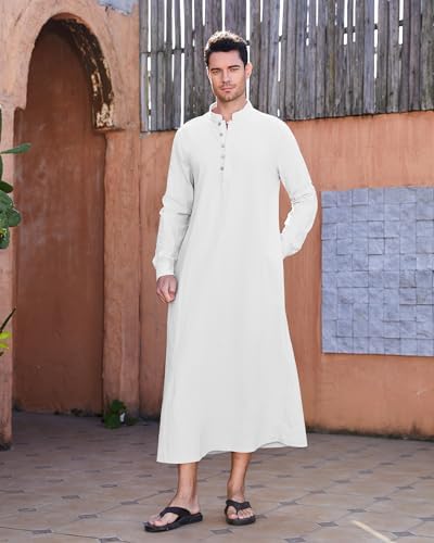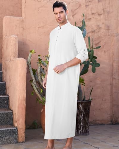 NANAMEEI Thobe for Men Long Sleeve Cotton Linen Kaftan Robe Muslim Abaya Casual Button Down Nightshirts Full Length