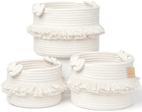 3 Beautiful boho inspired baskets for endless organizing possibilities Securely nested and packaged so baskets maintain their shape Tassels are professionally packed to deliver in neat condition Made from 100% safe and thick cotton rope No sharp edges or faux leather, so they’re safe for baby & pets Chic, boho, neutral colors complement any decor style