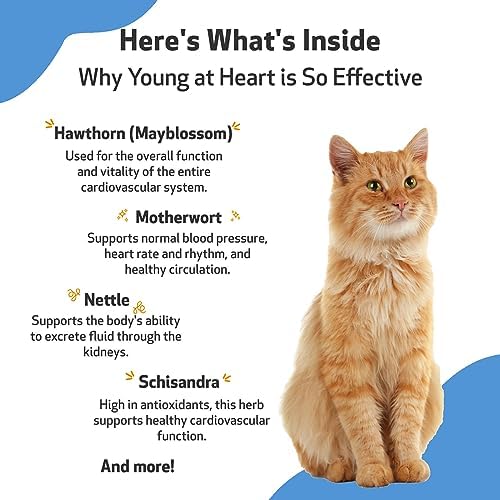 ✅ HEART HEALTH. As our pets age, they may require support to help maintain normal heart (cardiovascular) health and keep them feeling their best. Young at Heart’s vet-formulated blend of 8 herbs work together to help maintain your cat’s heart health.