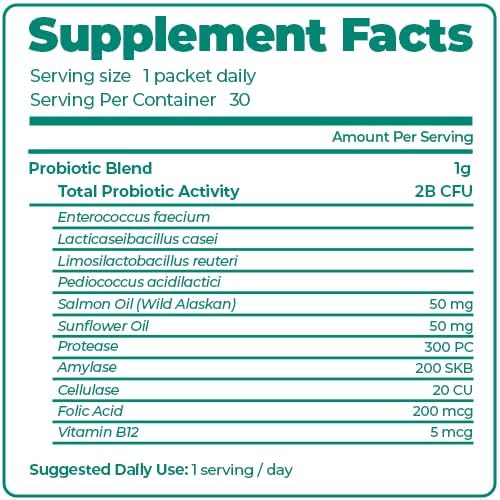 💪𝗛𝗶𝗴𝗵 𝗣𝗼𝘁𝗲𝗻𝗰𝘆: PetCultures skin and coat dog supplements each packet contains 50mg Salmon Oil (Wild Alaskan), 50mg Sunflower Oil, 200mcg folic acid, and 5mcg vitamin B12 complemented by 2 billion CFU of total probiotic activity contributing to the overall health of your dog.