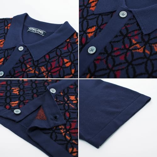 PJ PAUL JONES Mens Knit Polo Shirts 70s Vintage Patterned Knitted Shirt Short Sleeve Button Down Knitwear