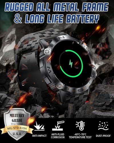 ⌚【MILITARY-GRADE CERTIFIED ALL-METAL FRAME】Our military-grade smartwatch endures the toughest durability tests on Earth, simulating deserts, rainforests, and Arctic conditions. It undergoes 15 stringent trials, guaranteeing unmatched resilience. This rugged timepiece is smart enough for accessibility, empowering wearers in any environment. With IP67 waterproofing, it withstands splashes, sweat, and light rain, perfect for everyday use (not suitable for swimming or prolonged submersion).