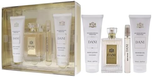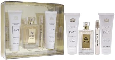 Prestige Dani by New Brand for Women – 4 Pc Gift Set 3.4oz EDP Spray, 0.5oz EDP Spray, 4.3oz Shower Gel, 4.3oz Body Lotion